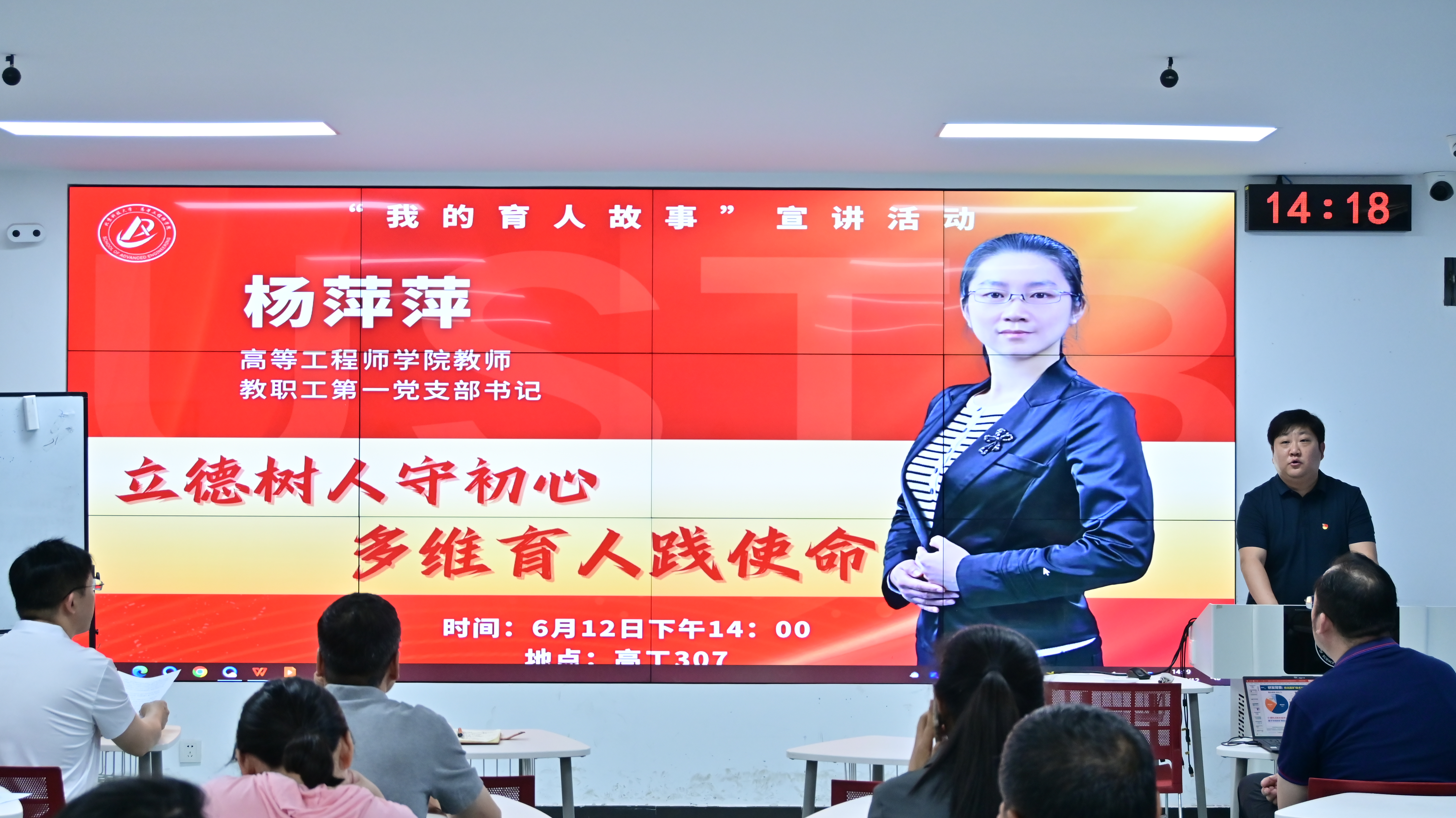 杨萍萍老师介绍了自己多年从教的基本情况,又从坚守立德树人初心,为党培育优秀人才;坚持以学生为根本,创新优化教学方法;推进课程思政融合,构建课赛协同体系以及深化科研反哺教学,助力学生创新发展四个方面讲述了在校工作的育人故事。杨萍萍在讲述中表示,三尺讲台存日月,愿以匠心致初心,未来将继续以“四有”好老师的标准为坐标,在教学创新中深耕课堂主阵地,在学科竞赛中构建实践共同体,在思政融合中筑牢信仰压舱石,让每个育人维度都闪耀着北科大“求实鼎新”的精神光芒。