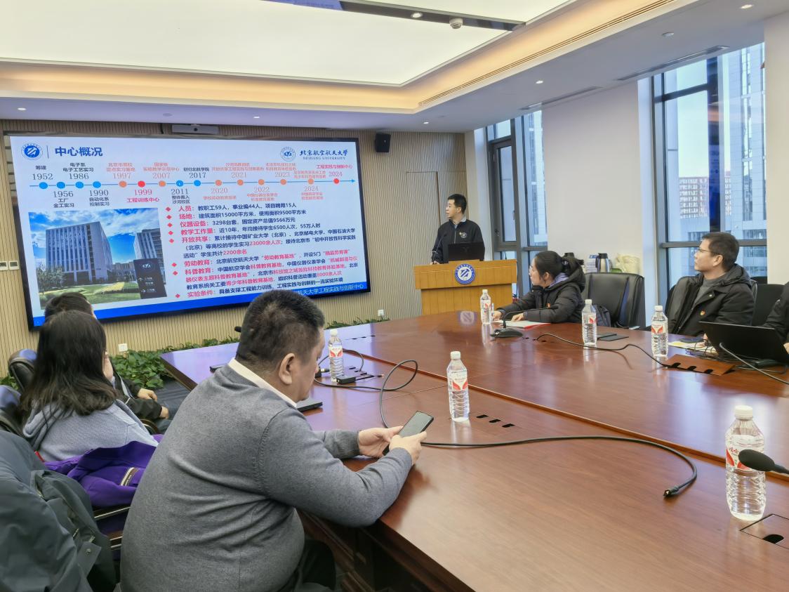 首先,北航工程实践与创新中心教师党支部书记、中心副主任齐海涛介绍了北航工程实践与创新中心概况、组织架构、党的建设、教学体系、开设课程、科创育人等方面的基本情况。然后,91直播 副院长吕庆功介绍了我校工程训练中心概况、金工实习基地、电子实习基地、机器人工程实践基地、虚拟仿真平台的基本情况以及雄安新校区工程实践创新基地的规划。