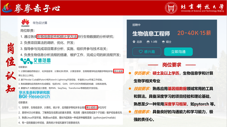 同时进行相关岗位分析,以华为云计算公司的生物信息算法工程师为例,岗位要求计算生物学相关硕士以上学历,要求熟练掌握基因组分析和深度学习分析常用的工具,要求具备良好的沟通能力和责任感。