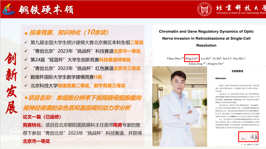 他积极参与各类竞赛,两年间,累计获得国家级、省市级奖项10余项,其中视网膜母细胞瘤项目转化到论文和挑战杯的竞赛中去,获得了北京朝阳医院眼科主任医师陶勇专家的推荐,取得了北京市一等奖的佳绩。