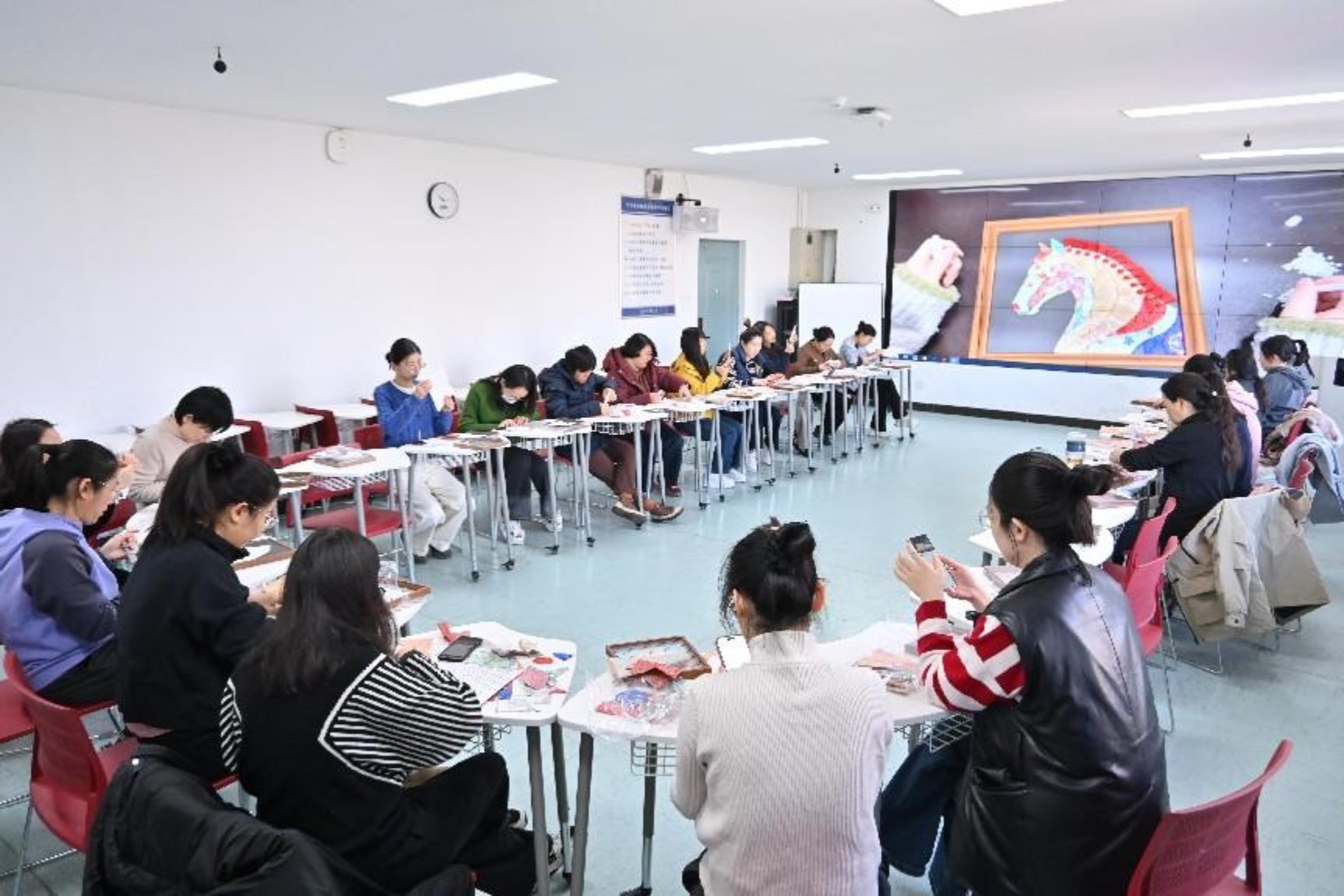 在制作环节,大家全神贯注、各展巧思。从挑选色彩斑斓的宋锦面料,到精心裁剪、拼贴出 “福” 字、葫芦、骏马等寓意吉祥的图案轮廓;从细致地粘贴珍珠作为点缀,到耐心地调整每一块锦缎的位置与角度,每一步都凝聚着匠心与巧思。