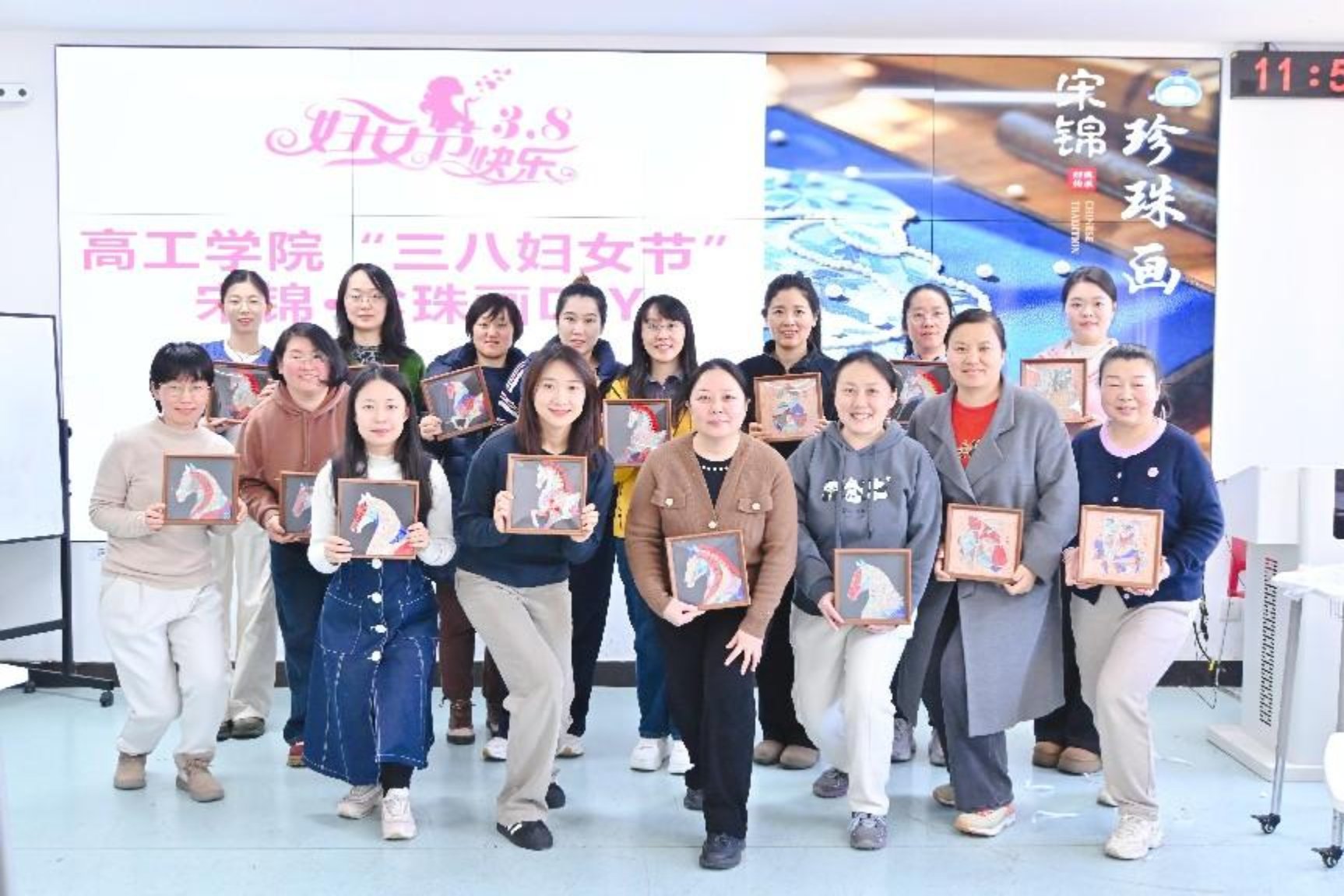 经过近两个小时的精心创作,一幅幅色彩丰富、造型别致的宋锦珍珠画作品跃然眼前。有的作品以骏马为形,寓意 “马到成功”;有的作品以葫芦为样,象征 “福禄双全”;还有的作品以 “福” 字为底,传递着满满的祝福。大家手捧着自己的作品,脸上洋溢着自豪与喜悦,纷纷合影留念,记录下这一美好时刻。