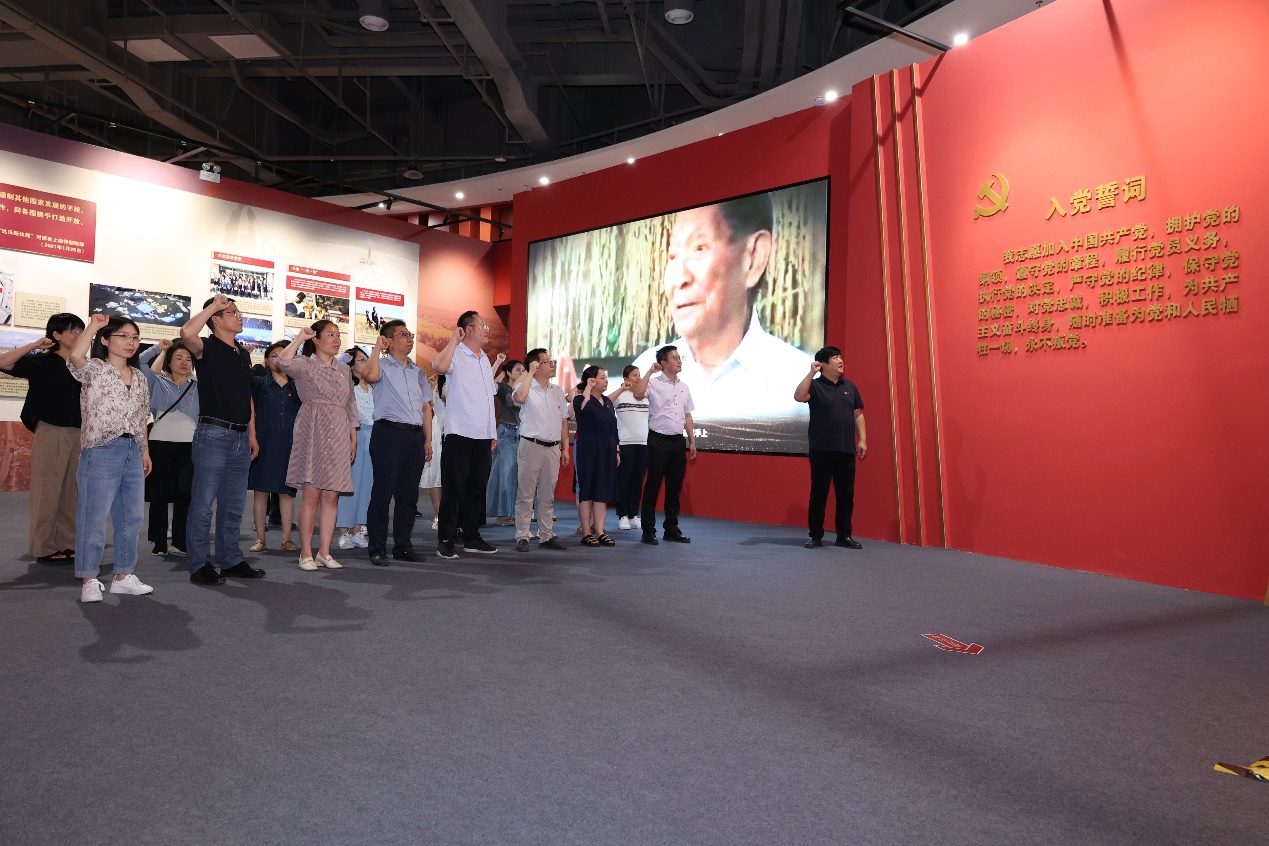 “我志愿加入中国共产党,拥护党的纲领,遵守党的章程,履行党员义务,执行党的决定,严守党的纪律,保守党的秘密,对党忠诚,积极工作,为共产主义奋斗终身,随时准备为党和人民牺牲一切,永不叛党”。在“共和国脊梁”展厅,由学院党委书记马聪领誓,学院班子及教职工党员面对鲜红的党旗,高举右拳,重温入党铮铮誓言。