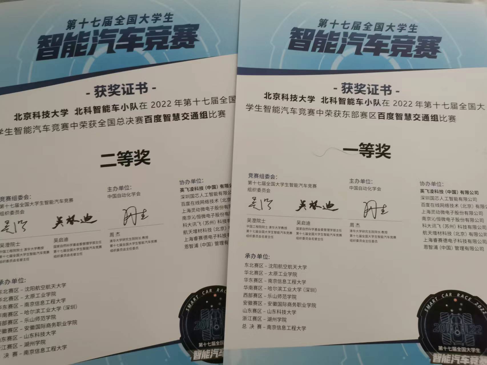 2022年8月18至22日,ENJOY AI Master暨第十七届全国大学生智能汽车竞赛华东赛及总决赛在南京信息工程大学成功举办。经过几天紧张激烈的角逐,91直播 机械工程学院赵鑫鑫教师、91直播 张一豆教师指导的北科智能车小队在400多支队伍中脱颖而出,荣获百度智慧交通组东部赛区比赛一等奖、全国总决赛二等奖。