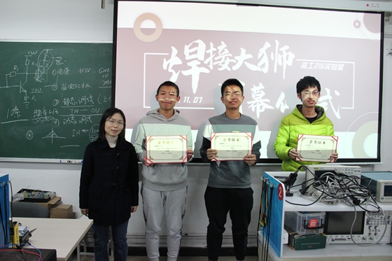 11月7日于高工216举办颁奖及闭幕仪式,有幸请到了电子技术实习基地白艳茹老师、高工20级辅导员李婷老师作为颁奖嘉宾出席活动。吕振老师表示希望大家在这个过程中有所收获,实验室会一直为大家提供学习和成长的平台,李婷老师表示感谢实验室为同学们提供的接触焊接的的机会,白艳茹老师表示电子技术实习基地会一直欢迎同学们。