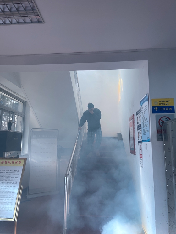 消防疏散演练在急促的警报声中拉开帷幕,保卫处指导人员随即在高工楼一楼出口处放出模拟烟雾,相关人员按照消防演练方案到达指定岗位,迅速组织师生沿着指定路线快速、有序地撤离到安全地带。