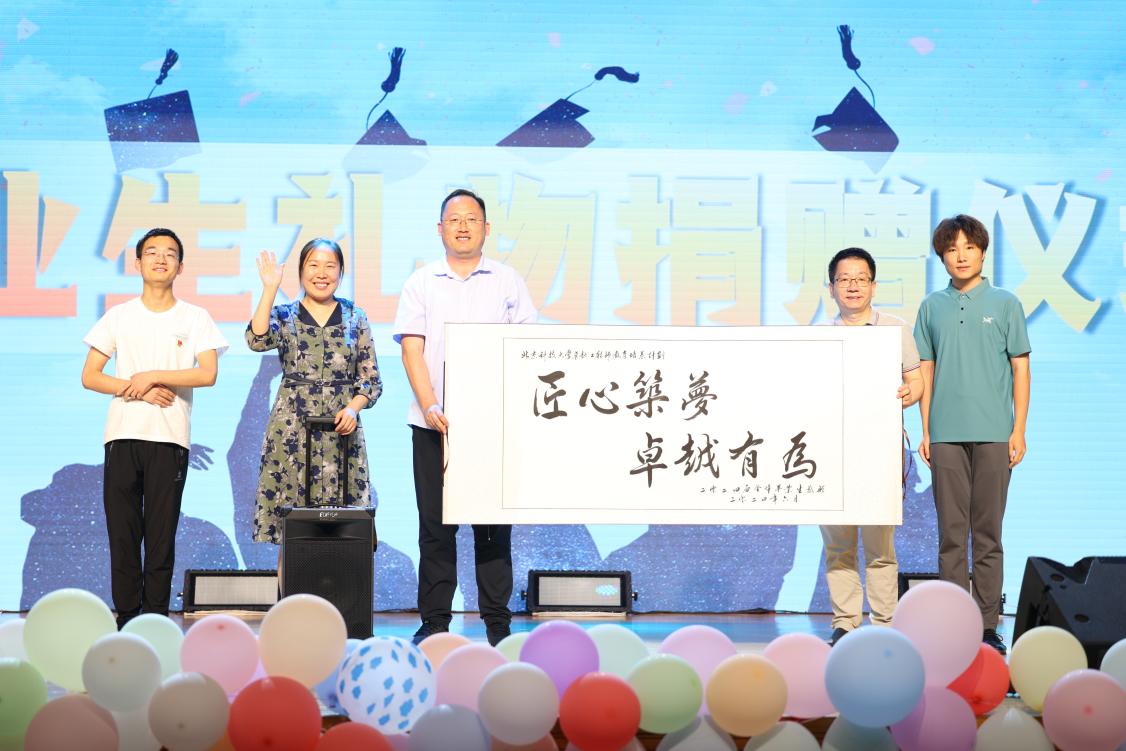 由高工本20级党支部牵头,全体毕业生向学院献上一台漫步者音响和一幅书法。副院长吕庆功、刘征建、刘娜代表学院上台接受毕业生礼物。